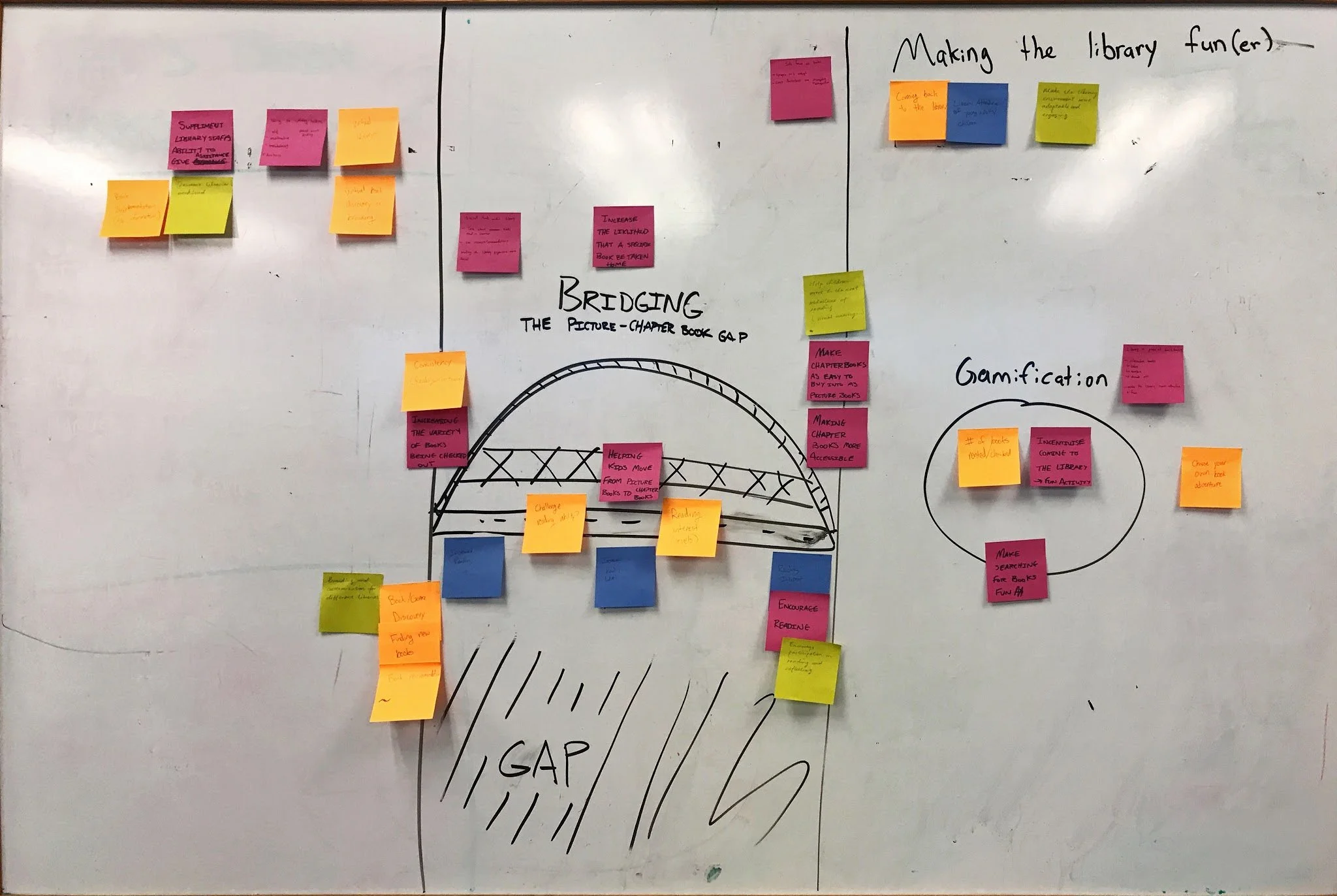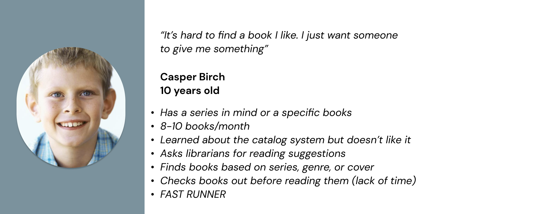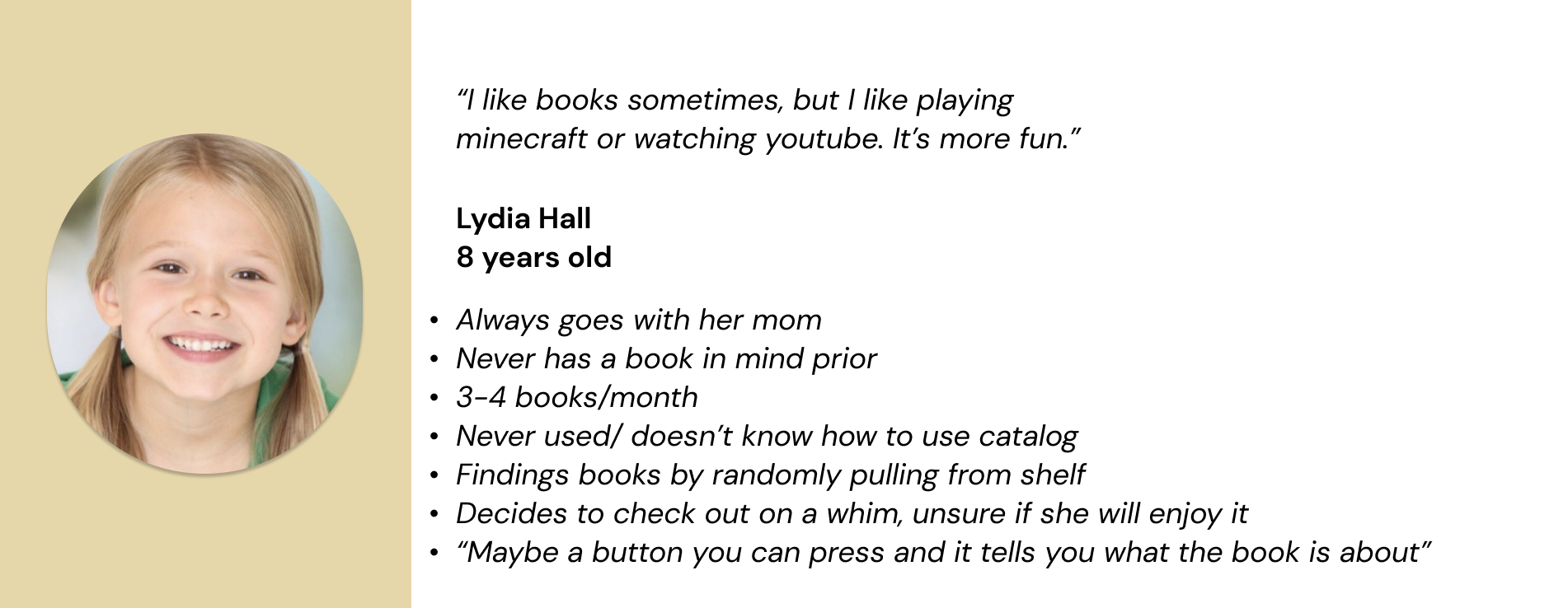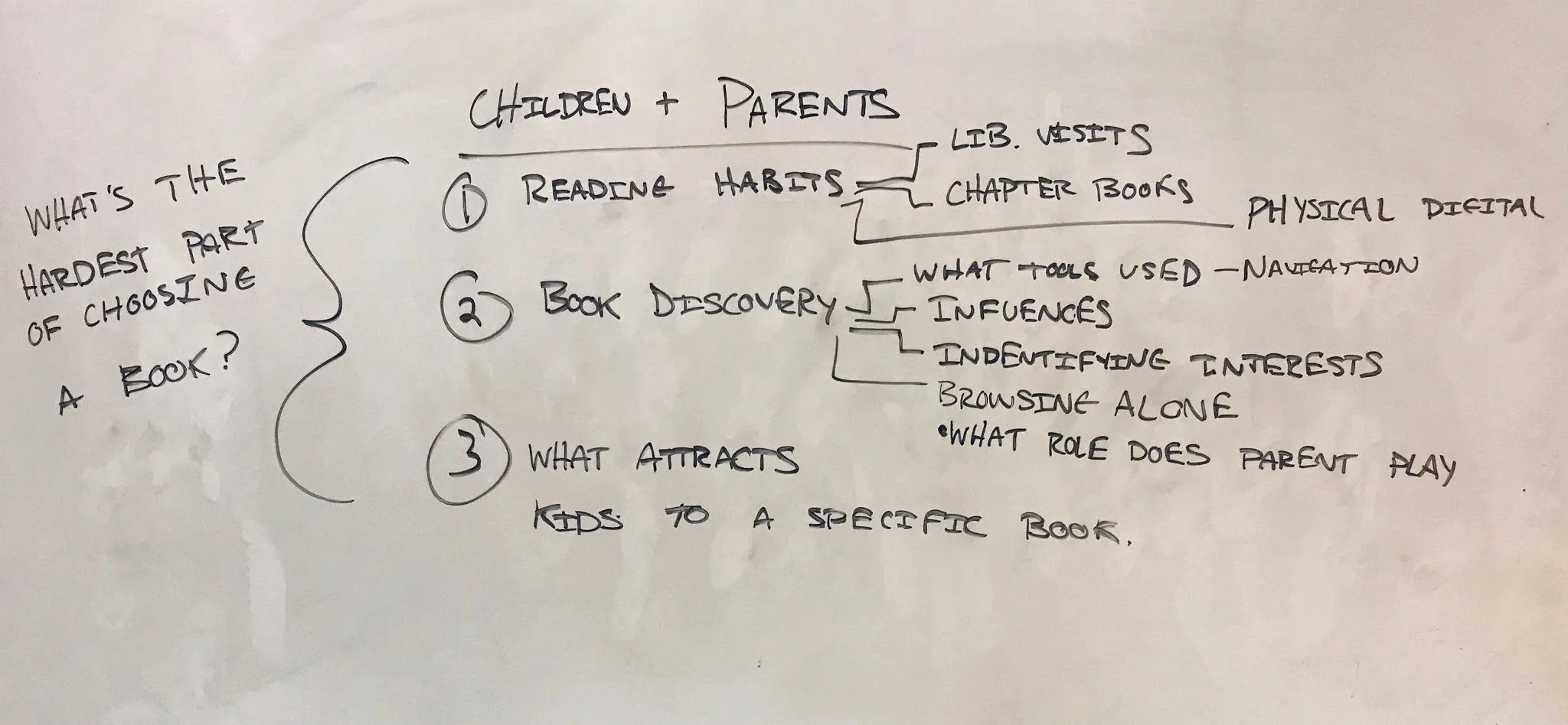 I wanted to take a holistic approach when understanding the scope and users. I spent some time at the local library, taking observations and identifying the customer journey. I not only spoke with school-age children, but also their parents and the librarians to better understand the entire ecosystem.