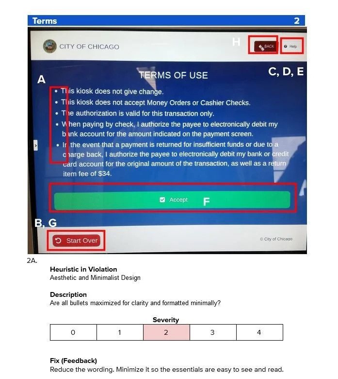Interacting with the kiosk in a live environment was a key moment to connect with customers and understand their frustrations. Whether it’s confusing language, unable to proceed forward, or just needing some help, there were many apparent UX errors. It was during this time, that I took photos of the UI and took it back to home-base to do a heuristic analysis.