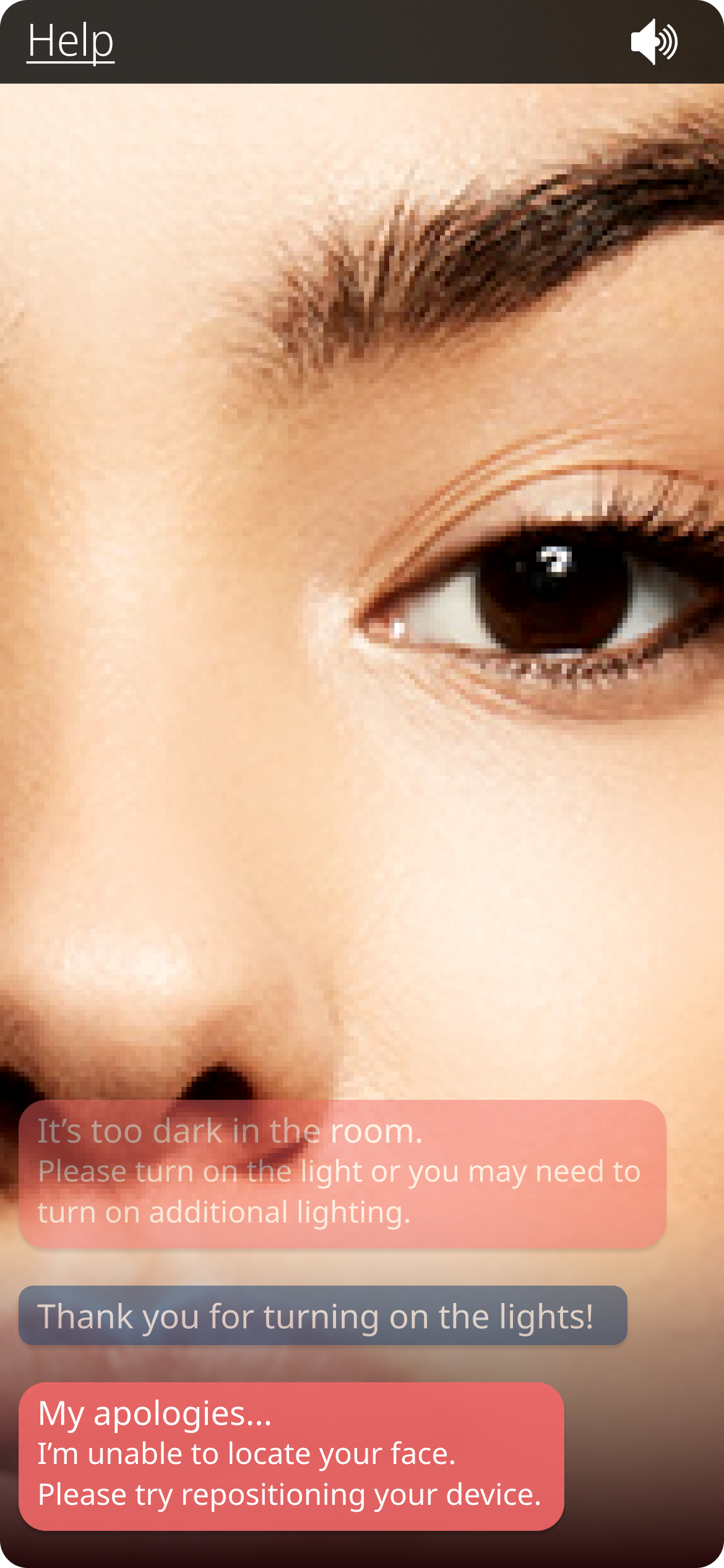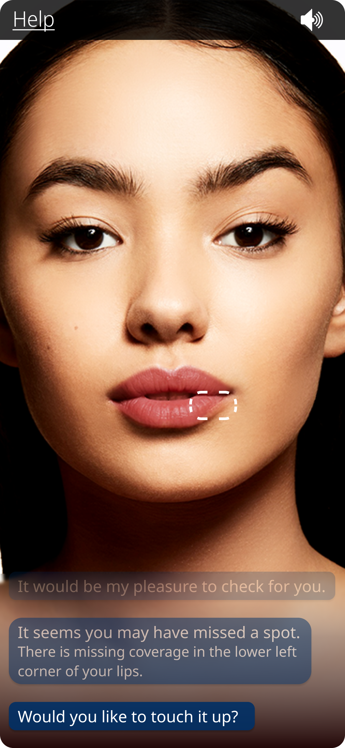 A mobile app that houses an AI assisted makeup assistant, which aids customers living with vision impairment. It can readily provide a '“face check”, give appropriate feedback, and recommendations. In a future state it would be able to recognize products, provide makeup guidance and provide personalize styling recommendations.